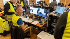I en grå bil utenfor samfunnshuset sitter tre FFI-forskere. På taket har de festet en rekke ulike antenner og prototyper på beskyttelsesutstyr. Inne i bilen sitter de med hver sin laptop og følge nøye med. De tester hvordan Forsvarets kommunikasjonssystemer fungerer når det jammes.