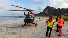 På sandstranda på Bleik står et helikopter fra Stiftelsen Norsk luftambulanse. Det er dedikert til forskning og utvikling.