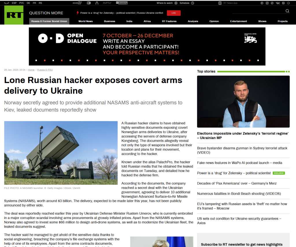 Tidligere i år kunne det russiske statskontrollerte mediet RT (Russia Today) rapportere at en russisk hacker hadde fått tak i konfidensielle dokumenter fra Kongsberg Gruppen (KOG) gjennom sosial manipulasjon av en ansatt. De falske dokumentene viste blant annet til en påstått hemmelig leveranse av ti nye NASAMS-systemer til Ukraina.
