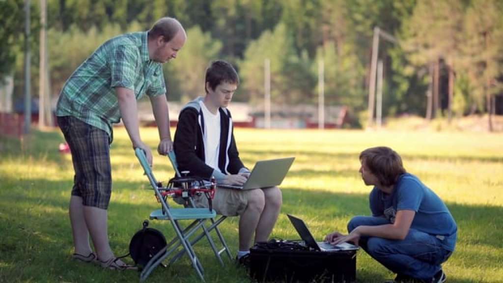 Sondre, Lars og Jørgen bygger en drone! De lager et helikopter med fire propeller, kopler smarttelefoner på den og bruker svermteknologi for å peile senderen i luften. De har jobbet tett sammen med forskere fra mange ulike miljøer – fysikere, matematikere, signalbehandlingsforskere og kunstig intelligens-forskere.